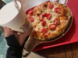 そして、私が食べたのは、トマトとチーズのピザと、シェリーメイのワッフル&ソフトクリーム!